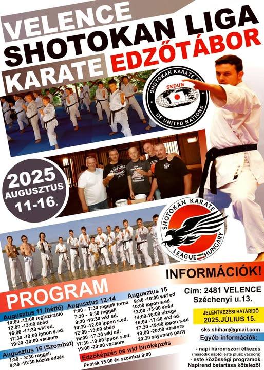 Sűrű szakmai program várta a Shotokan Liga /SKS-SKDUN HUNGARY (Shihan Juhász Ferenc), MSKSZ szövetség (Shihan Kozma Erzsébet), SDSZ Szövetség (Sensei Takács Miklós) / karatésait augusztus 11-én, hétfőtől augusztus 16-án, szombatig az éves központi karate edzőtáborban Velencén.