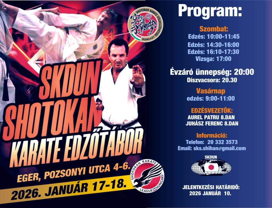 Mozgalmasan indult a 2026-os év a karatésok számára: január 17-18. között Eger adott otthont a Shotokan Karate Stílusszövetség (SKDUN Hungary) évnyitó edzőtáborának. A rendezvény népszerűségét jól mutatja, hogy 23 egyesületből összesen 160 karatéka húzott gi-t, hogy közösen kezdjék meg a felkészülést az előttünk álló időszakra.